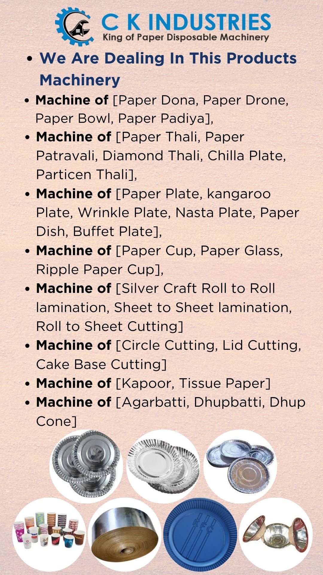 CK Industries is one of the oldest and trusted hub for small business solutions. Established in 2011 with the purpose of creating more entrepreneurs and business opportunities in disposable paper products in all over India. We are manufacturing all types of disposable paper product machinery, supplier of raw materials and also exporter. We support our client to develop their business in all expects by providing technical support, marketing guidance and seasonal sales strategy according to their city and state.